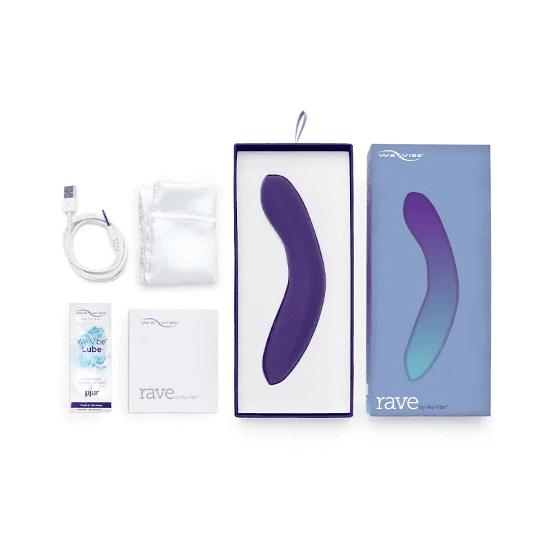 Rave by We-Vibe G-Spot Stimulator USB Cable USB to charge via any USB port or widely available USB power adapter (not included) Storage Bag Sleek carrying case for convenient storage and travel Quick Start User Guide Multilingual, illustrated user guide